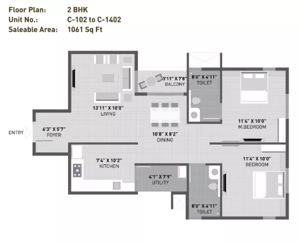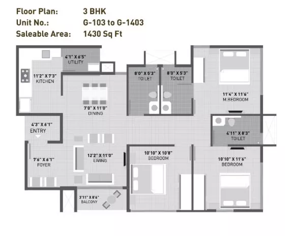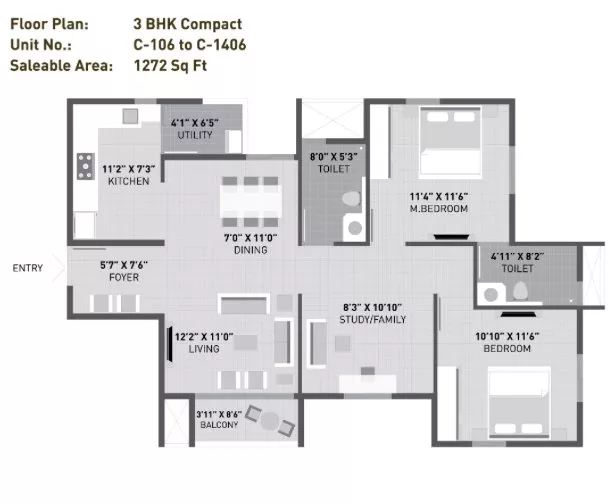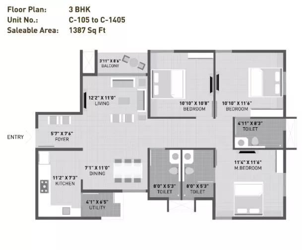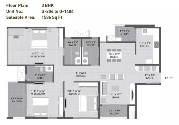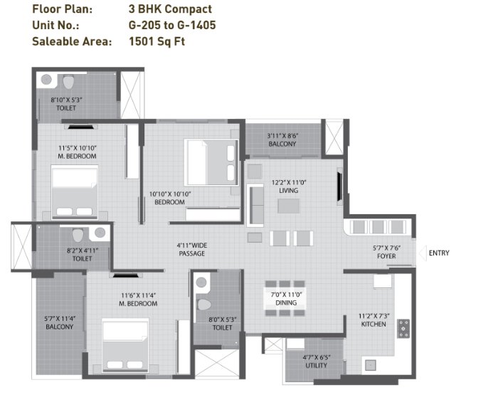 Vitrified tiles in the foyer, living room, dining area, and corridors