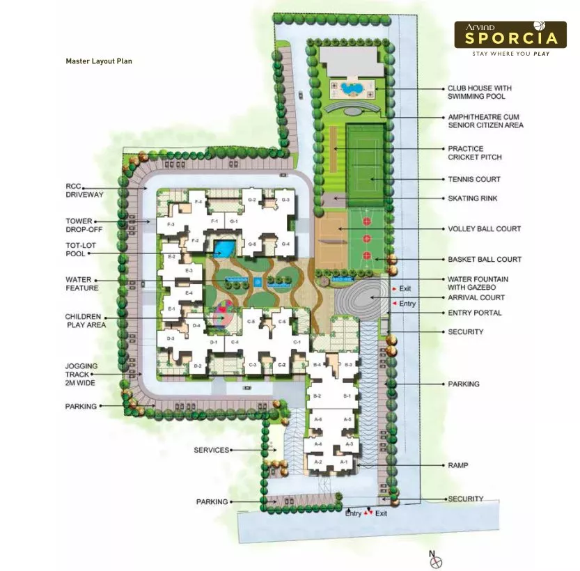 The amenities at Arvind Sporcia include a fully equipped clubhouse, landscaped gardens, gymnasium, swimming pool, recreation rooms, outdoor sports courts, children’s play area, party hall, and advanced 24/7 security systems, ensuring a safe and luxurious living environment.