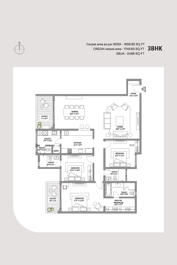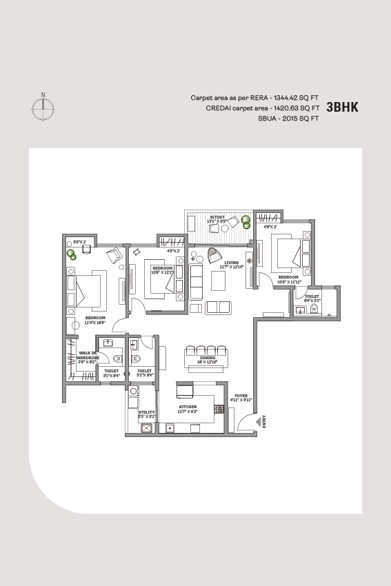 Vitrified tile or marble flooring in the foyer, living room, dining area, corridors, and all bedrooms.
