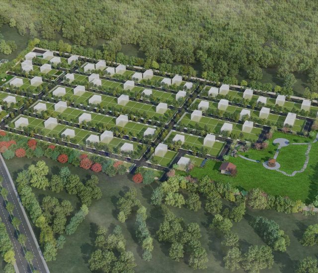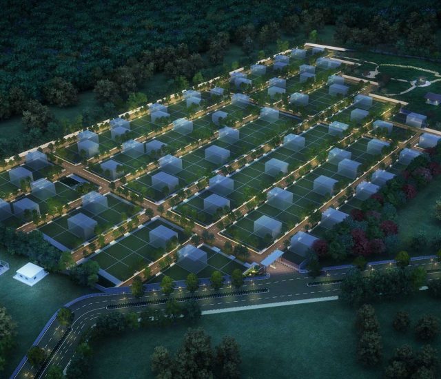 Underground solar street lights and fiber optic pipes for each home, designed for future-proof connectivity.