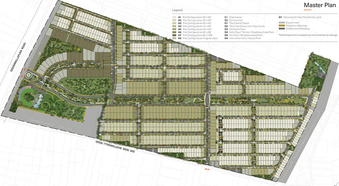 Total Environment Tangled Up in Green Plots is an upscale plotted development located along the Doddaballapura–Devanahalli Main Road in North Bangalore. Spanning over 110 acres of lush greenery, this project marks Total Environment’s first foray into plotted developments in the region, showcasing their commitment to quality construction.