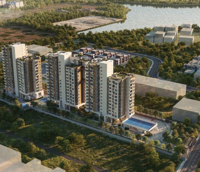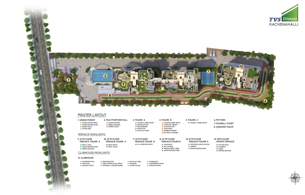TVS Emerald Isle of Trees is surrounded by beautiful landscapes, with serene views of Rachenahalli Lake and 80% open spaces, making it a special and elite living destination.